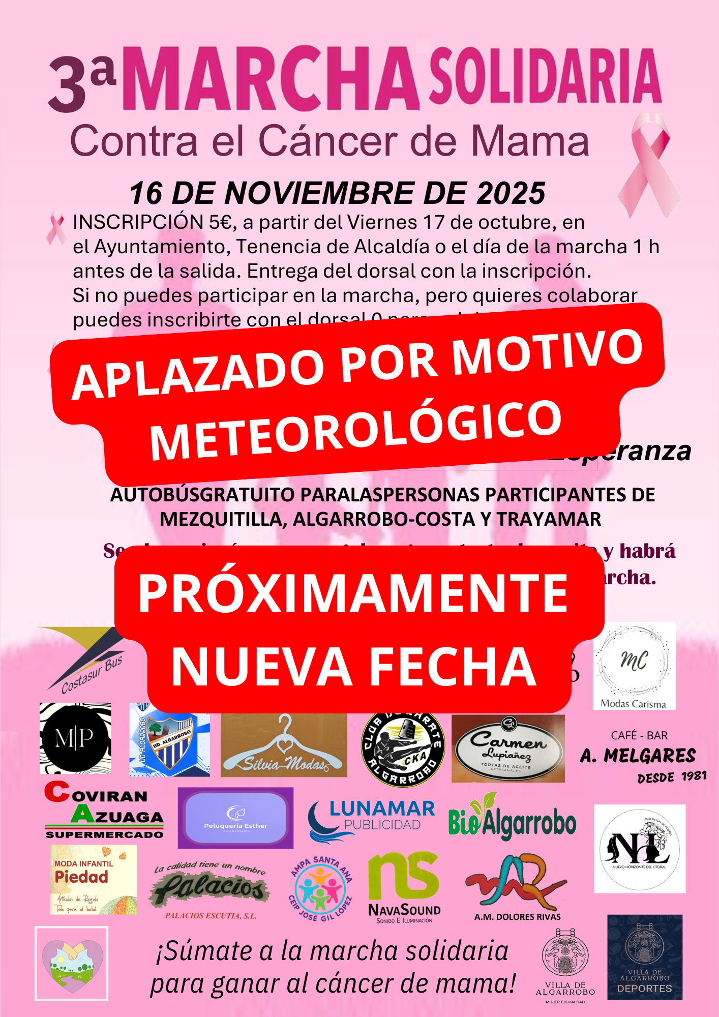 📢 Informamos que, debido a las condiciones meteorológicas prevista, la Marcha Solidaria para este domingo ha sido aplazada. 🌧️ pronto anunciaremos la nueva fecha.