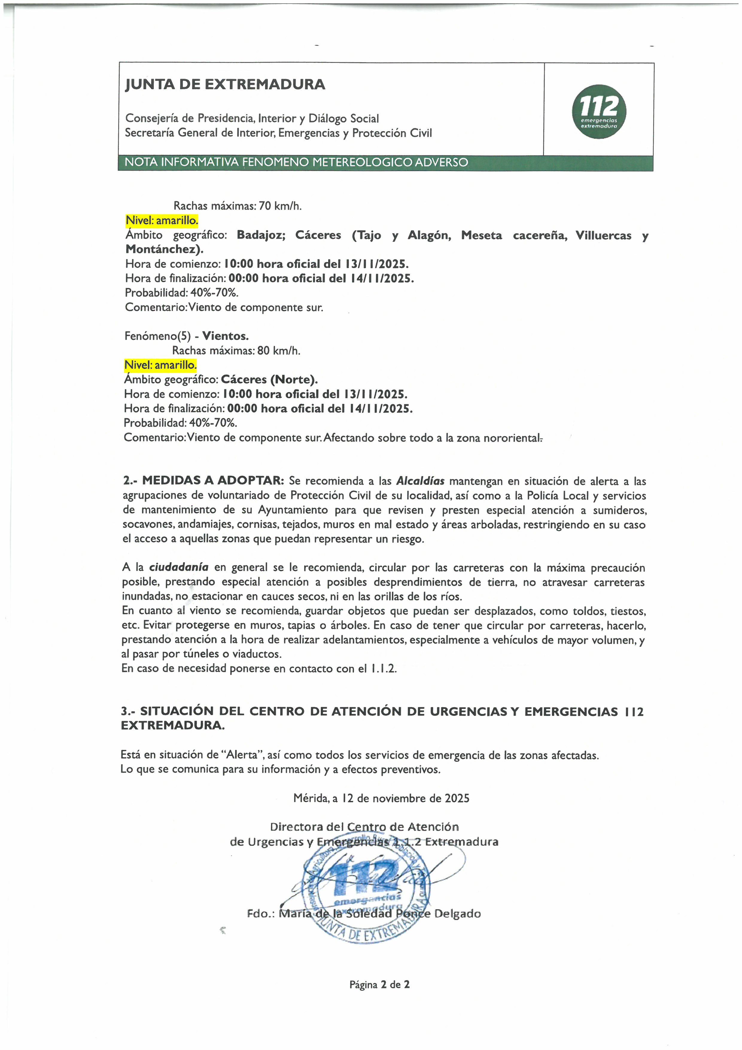 El servicio 112 comunica que la alerta estará activa desde el jueves, 13 de noviembre de 2025, 14:00 h hasta el viernes, 14 de noviembre de 2025, 00:00 h (hora peninsular).