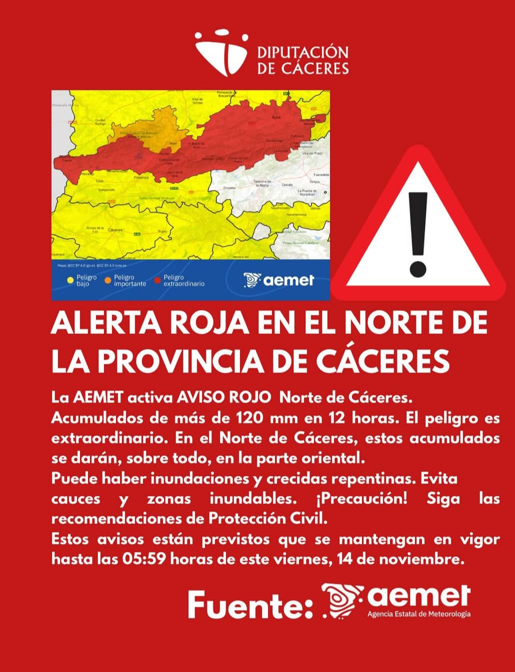 ¡ALERTA ROJA 🔴 POR LLUVIAS EN EL NORTE DE CÁCERES! 🌧️⚠️¡MANTENEMOS LA ALERTA AMARILLA EN TODA EXTREMADURA! 🟡⛈️MÁXIMA PRECAUCIÓN EN DESPLAZAMIENTOS Y ZONAS INUNDABLES 🙏🚫🌊 🙋🏼♀️