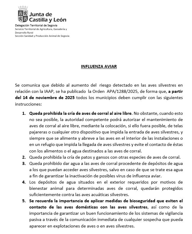 Se comunica que debido al aumento del riesgo detectado en las aves silvestres en relación con la IAAP, se ha publicado la Orden APA/1288/2025, de forma que, a partir del 17 de noviembre de 2025 todos los municipios deben cumplir con las siguientes instrucciones: