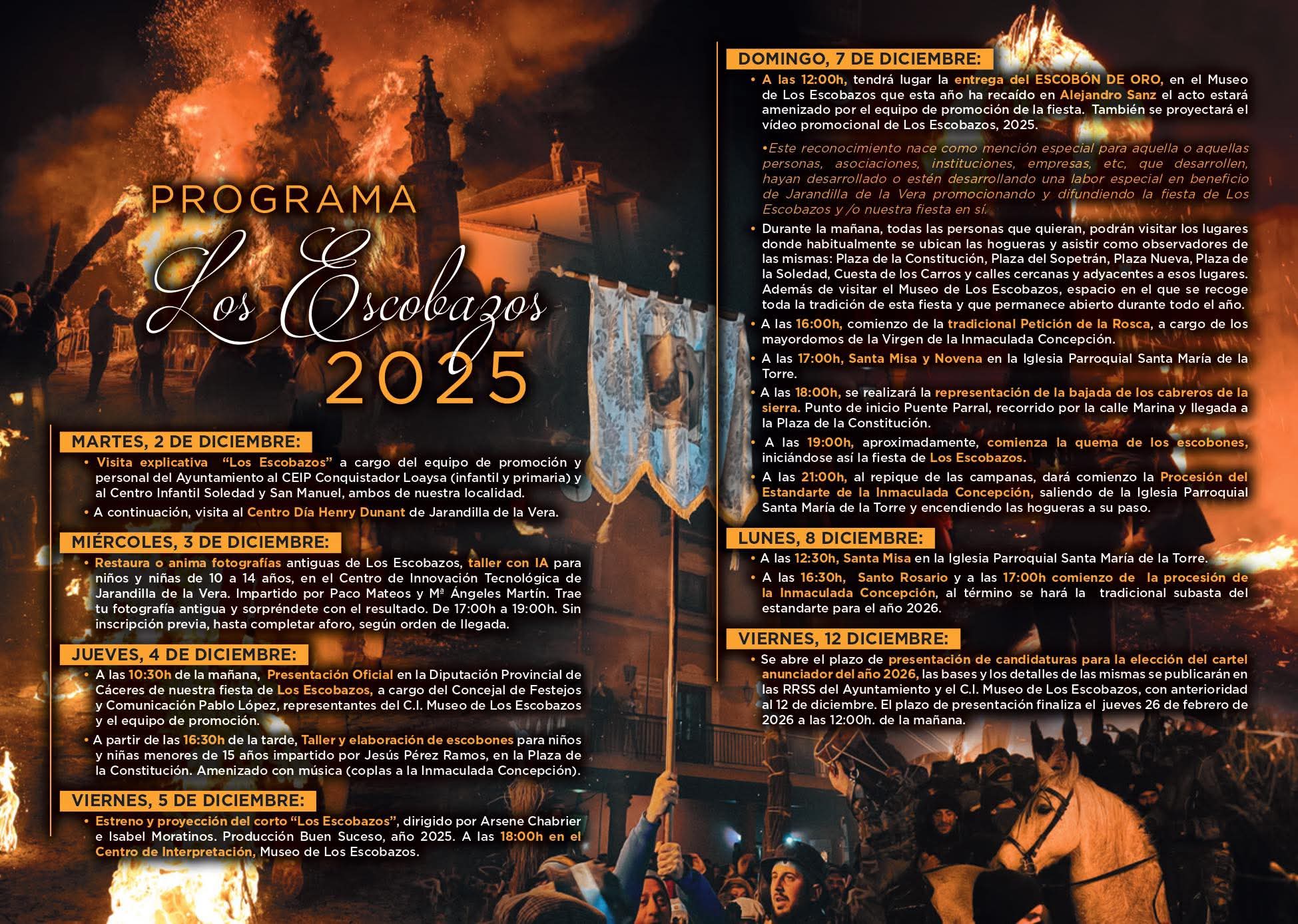 Nuestra fiesta de 🔥Los Escobazos🔥, celebrada en honor a la Inmaculada Concepción, se prepara para una nueva edición este 2025. El programa oficial de esta espectacular fiesta de fuego declarada de Interés Turístico Nacional ya está disponible y os lo mostramos a continuación: