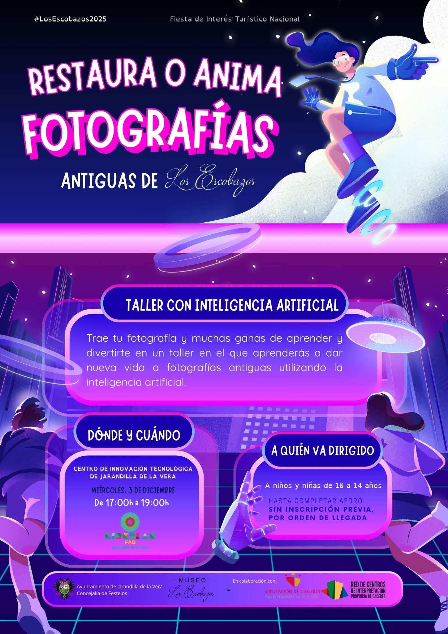 Dentro del programa de actividades de nuestra fiesta éste 2025, incluimos el siguiente taller; "Restaura o anima fotografía antigua de 🔥Los Escobazos🔥 con IA", donde niños y niñas aprenderán a dar nueva vida a fotografías antiguas utilizando la inteligencia artificial. Este taller está diseñado para estimular la creatividad, el trabajo en equipo, el aprendizaje tecnológico y el valor de las tradiciones, todo mientras se explora el mundo fascinante de la fotografía.