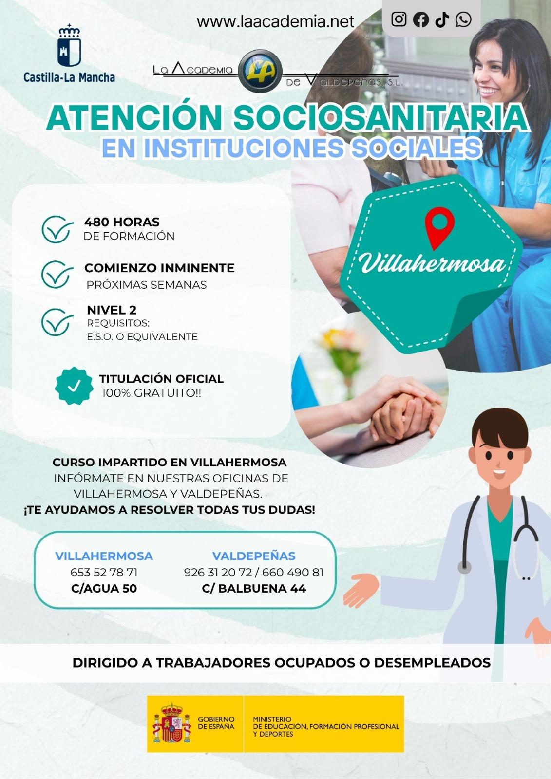 El Ayuntamiento de Villahermosa informa de la puesta en marcha de una nueva formación oficial en Atención Sociosanitaria en Instituciones Sociales, dirigida a trabajadores ocupados y personas desempleadas.