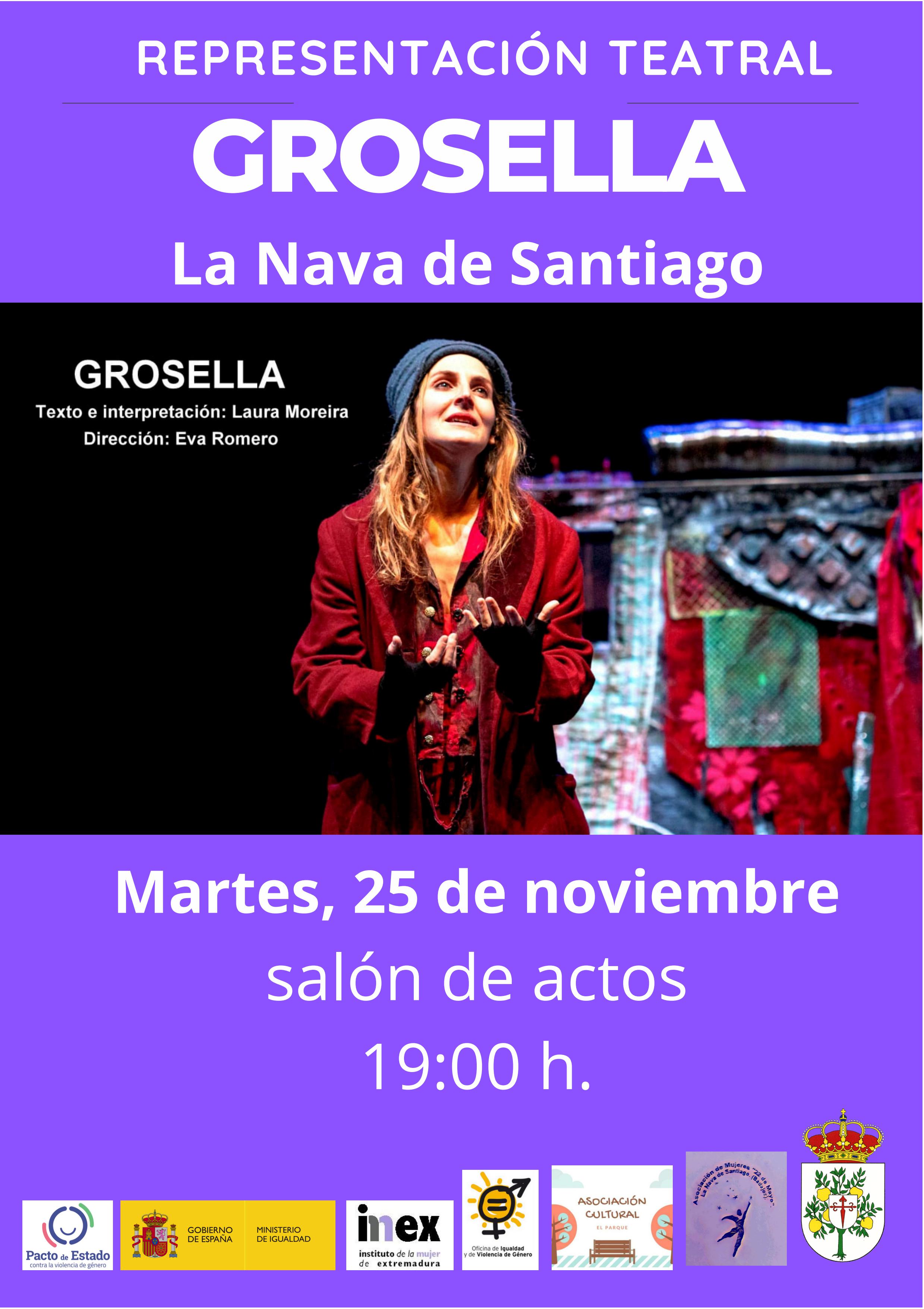 El martes 25 de noviembre, a las 19:00 h, tendrá lugar en el Salón de Actos la representación teatral Grosella, interpretada por la actriz Laura Moreira y bajo la dirección de Eva Romero.