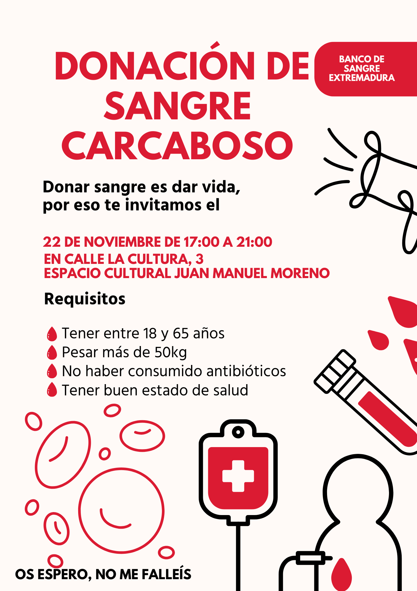 Estimados/as Carcaboseñ@s y vecinos de pueblos limítrofes os recordamos que hoy sábado día 22 de Noviembre de 2025 desde las 17:00 hasta las 21:00 horas en el Espacio Cultural Juan Manuel Moreno se realizarán extracciones de sangre para l@s donantes de la localidad y pueblos limítrofes por el Banco de Sangre de Extremadura.