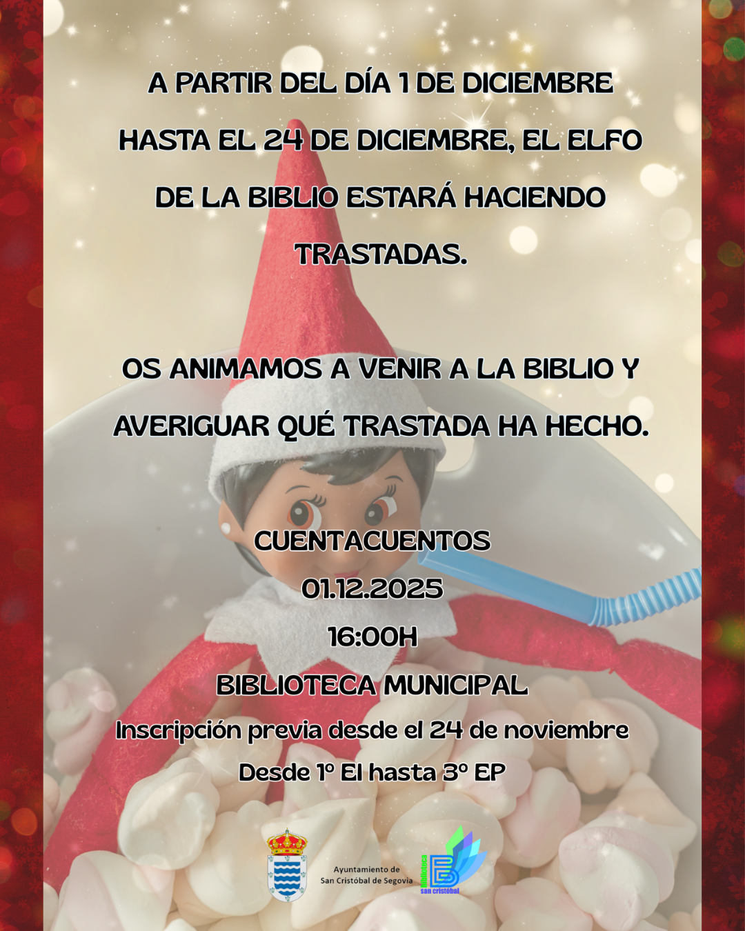 🎄✨ ¡Empieza la magia navideña en la Biblio! El lunes 1 de diciembre a las 16:00h tenemos cuentacuentos para los peques de 1º de infantil a 3º de Primaria 📚🧝♂️ ¡Ven a descubrir qué travesura ha hecho el Elfo de la Biblio y disfruta de una tarde llena de historias y diversión!