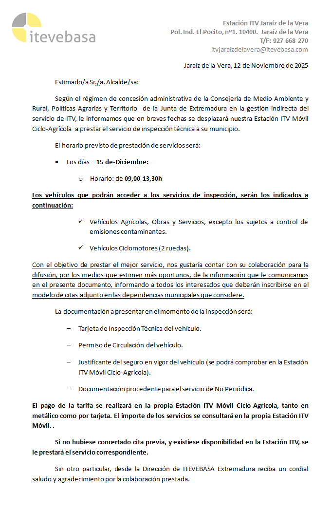 La ITV del ciclo agrícola se desplazará a nuestro municipio el próximo 15 de diciembre para prestar el servicio de inspección técnica. Las personas interesadas deberán apuntarse en las oficinas del Ayuntamiento hasta las 13:00 horas del 10 de diciembre de 2024.