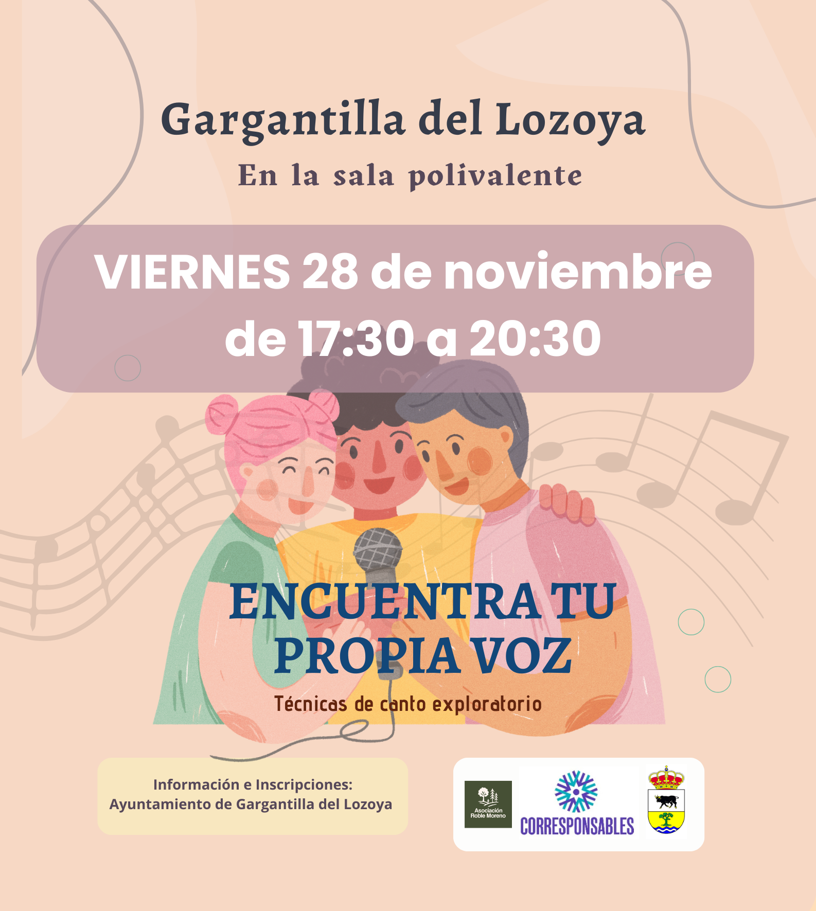 🎤🎙️Taller "Encuentra tu voz" con técnicas de canto exploratorio🎤🎙️📍Centro Polivalente (Gargantilla del Lozoya)📆 28/11 🕒 17:30📋 Ayuntamiento📩 aytogarpin@ayuntamiento.madrid.org 📞 918695013