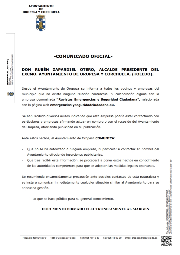 ℹ️ El Ayuntamiento de Oropesa informa a todos los vecinos y empresas del municipio que no existe ninguna relación contractual ni colaboración alguna con la empresa denominada “Revistas Emergencias y Seguridad Ciudadana”, relacionada con la página web emergencias yseguridadciudadana.eu.