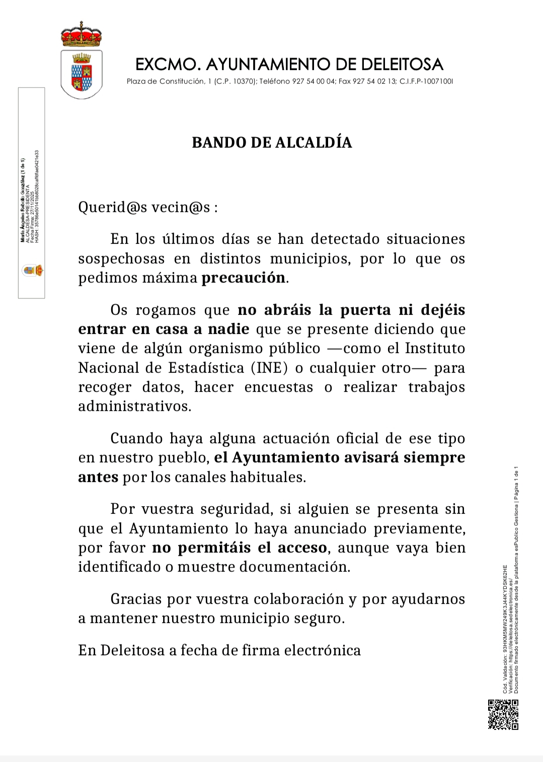 EN EL ARCHIVO ADJUNTO TENÉIS EL BANDO QUE AVISA DE PERSONAS QUE, EN OTROS PUEBLOS, SE HACEN PASAR POR ORGANISMOS OFICIALES PARA ENTRAR EN LAS CASAS Y ROBAR. 🚨