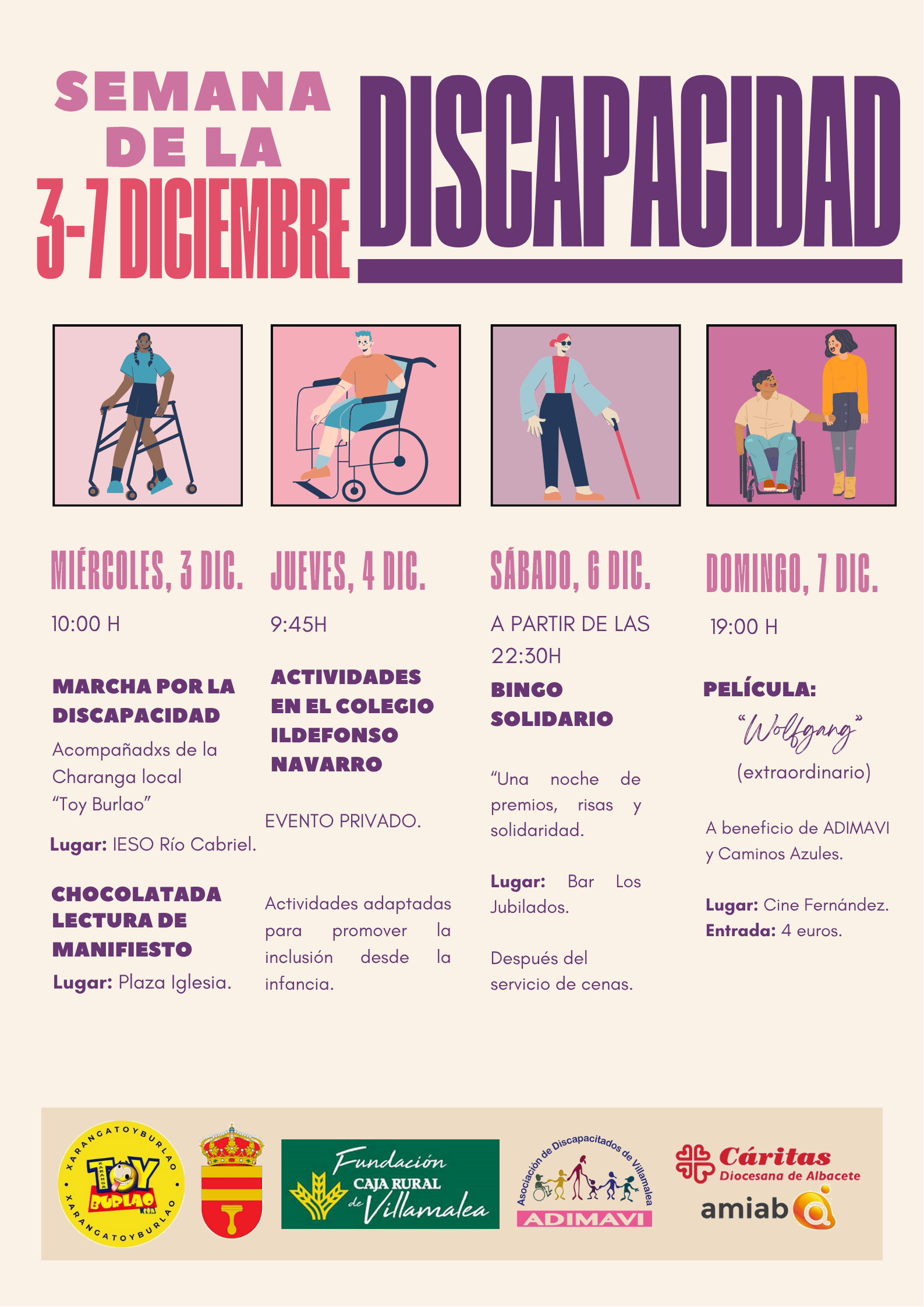 Como cada aรฑo, desde las 10:00h en el Instituto Rรญo Cabriel comenzarรก una marcha para visibilizar la discapacidad junto a todos aquellos que deseen unirse. Finalizarรก en la Plaza de la Iglesia con la lectura de un manifiesto y una chocolatada organizada por la Asociaciรณn de Mujeres โLa Concepciรณnโ.