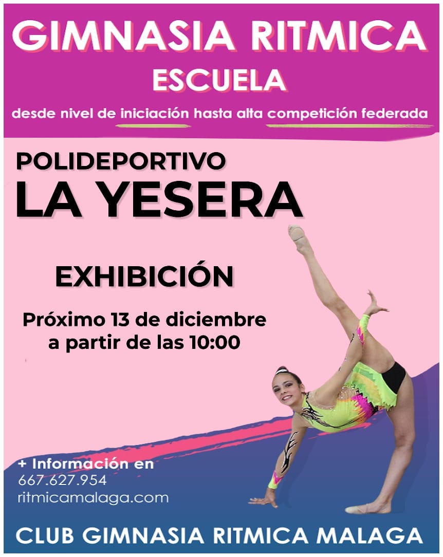 El próximo 13 de diciembre, a partir de las 10:00 horas, nuestro Polideportivo La Yesera acogerá una exhibición del Club Gimnasia Rítmica Málaga, una oportunidad fantástica para disfrutar del talento, el esfuerzo y la dedicación de jóvenes deportistas que se forman desde la iniciación hasta la alta competición federada.