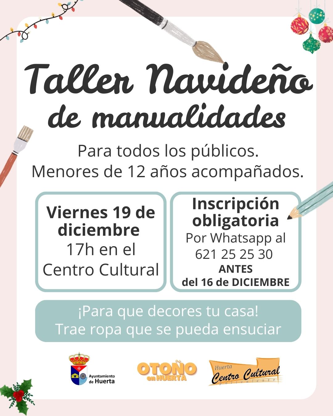 ¡Taller Navideño de Manualidades!📆 Viernes 19 de diciembre 🕔 a las 17h📍en el Centro Cultural📲 inscripciones abiertas hasta el 16 de diciembre🧑🧒menores de 12 años acompañados.