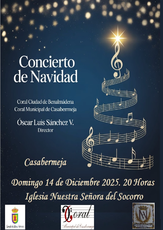 El Ayuntamiento de Casabermeja informa que el próximo domingo 14 de diciembre de 2025, a las 20:00 horas, podremos disfrutar del tradicional Concierto de Navidad en la Iglesia Nuestra Señora del Socorro.