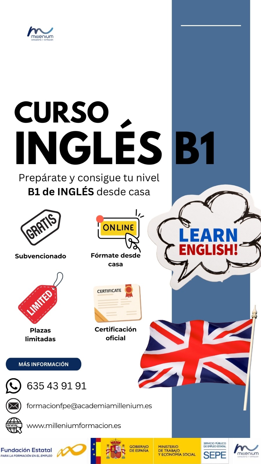 Desde Milenium Formación nos informan de la impartición próximamente de un curso de preparación para B1 de inglés para personas trabajadores de cualquier sector y personas desempleadas.
