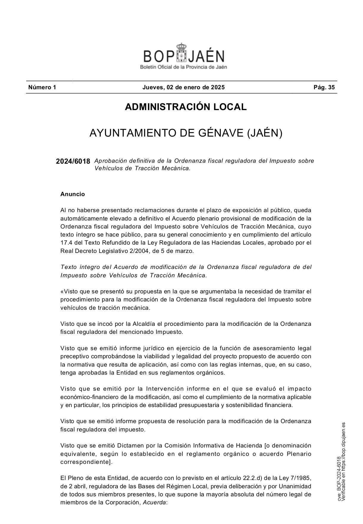La bonificación entra dentro de la nueva ordenanza fiscal reguladora del impuesto sobre Vehículos de Tracción Mecánica aprobada por el Ayuntamiento de Génave el pasado año. En ella se establece una bonificación del 50% a favor de los vehículos históricos o aquellos que tengan una antigüedad mínima de veinticinco años. En todo caso, el titular del vehículo debe estar empadronado en el municipio de Génave.