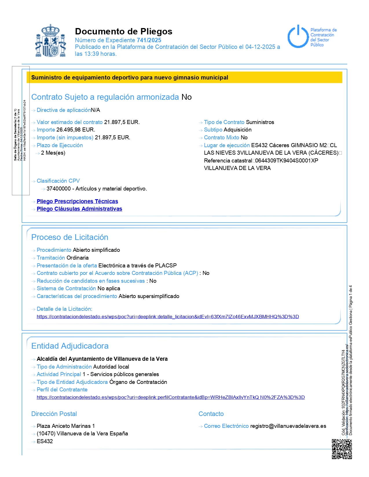 Te informamos que hoy ha sido publicado el anuncio de la LICITACIÓN para el suministro de equipamiento deportivo para nuevo gimnasio municipal.