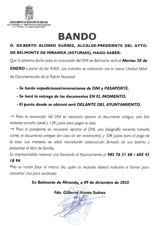 Información sobre la próxima fecha para renovación del DNI y Pasaporte en Belmonte