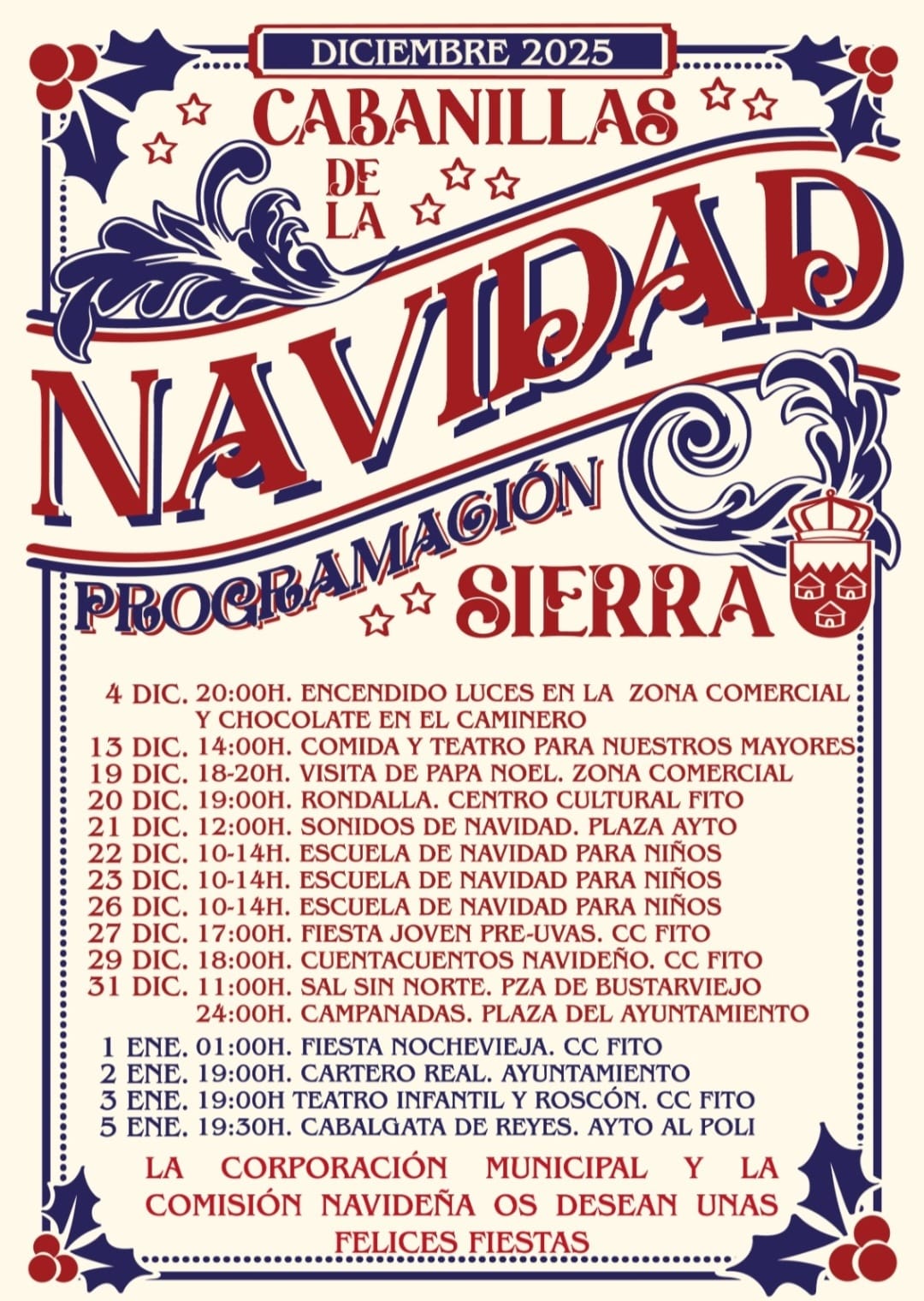 ¡La Navidad llega a Cabanillas de la Sierra! 🎄✨El Ayuntamiento de Cabanillas presenta la Programación de las Fiestas Navideñas 2025–2026, diseñada para fomentar la convivencia, la cultura y la participación de todos los vecinos.