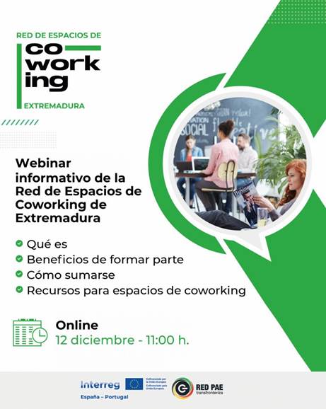 Informamos que el próximo 12 de diciembre de 2025, a las 11:00 horas, tendrá lugar una sesión informativa online sobre la Red de Espacios de Coworking de Extremadura.