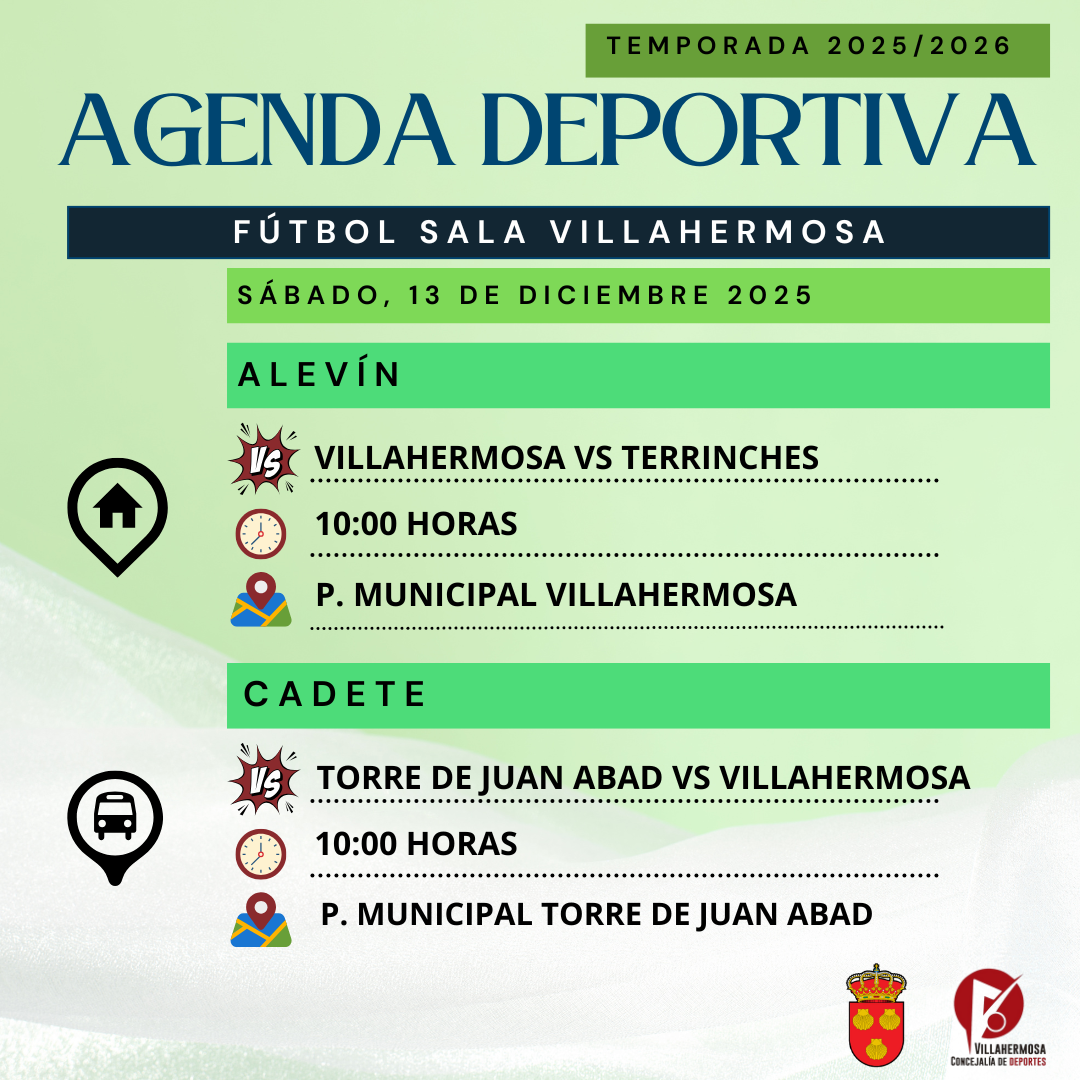 FĂștbol Sala VillahermosaAlevĂn Villahermosa VS Terrinches10:00 horas | P.Municipal VillahermosaTorre de Juan Abad VS Cadete Villahermosa10:00 horas | P.Municipal Torre de Juan Abad