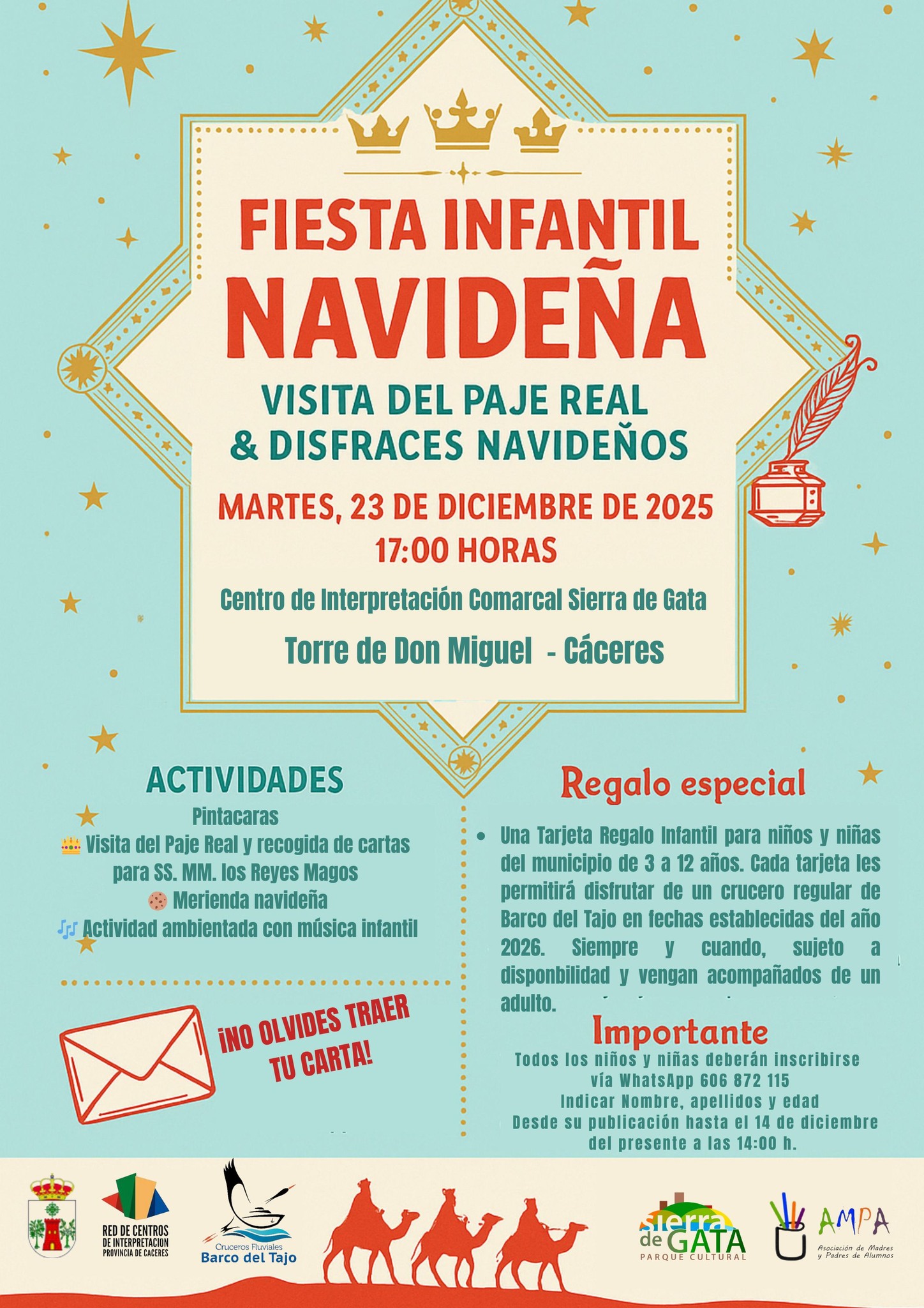 Los niños y niñas del municipio de 3 a 12 años que acudan recibirán una tarjeta regalo infantil, que permitirá disfrutar de un crucero regular del Barco del Tajo en 2026, sujeto a disponibilidad y siempre acompañados de una persona adulta.