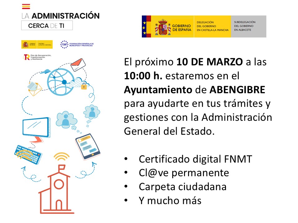 El próximo 10 DE MARZO a las 10:00 h. estaremos en el Ayuntamiento de ABENGIBRE para ayudarte en tus trámites y gestiones con la Administración General del Estado.