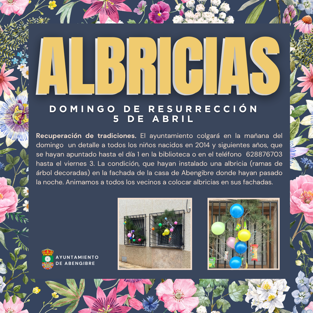 Recuperación de la tradición de las albricias. El ayuntamiento colgará en la mañana del domingo de resurrección un detalle para todos los niños nacidos en 2014 y siguientes años, que se hayan apuntado hasta el día 1 en la biblioteca o en el teléfono 628876703 hasta el viernes 3 de abril. La condición deberá ser que se haya instalado una albricia (ramas de árbol decoradas) en la fachada de la casa de Abengibre donde hayan pasado la noch(...)