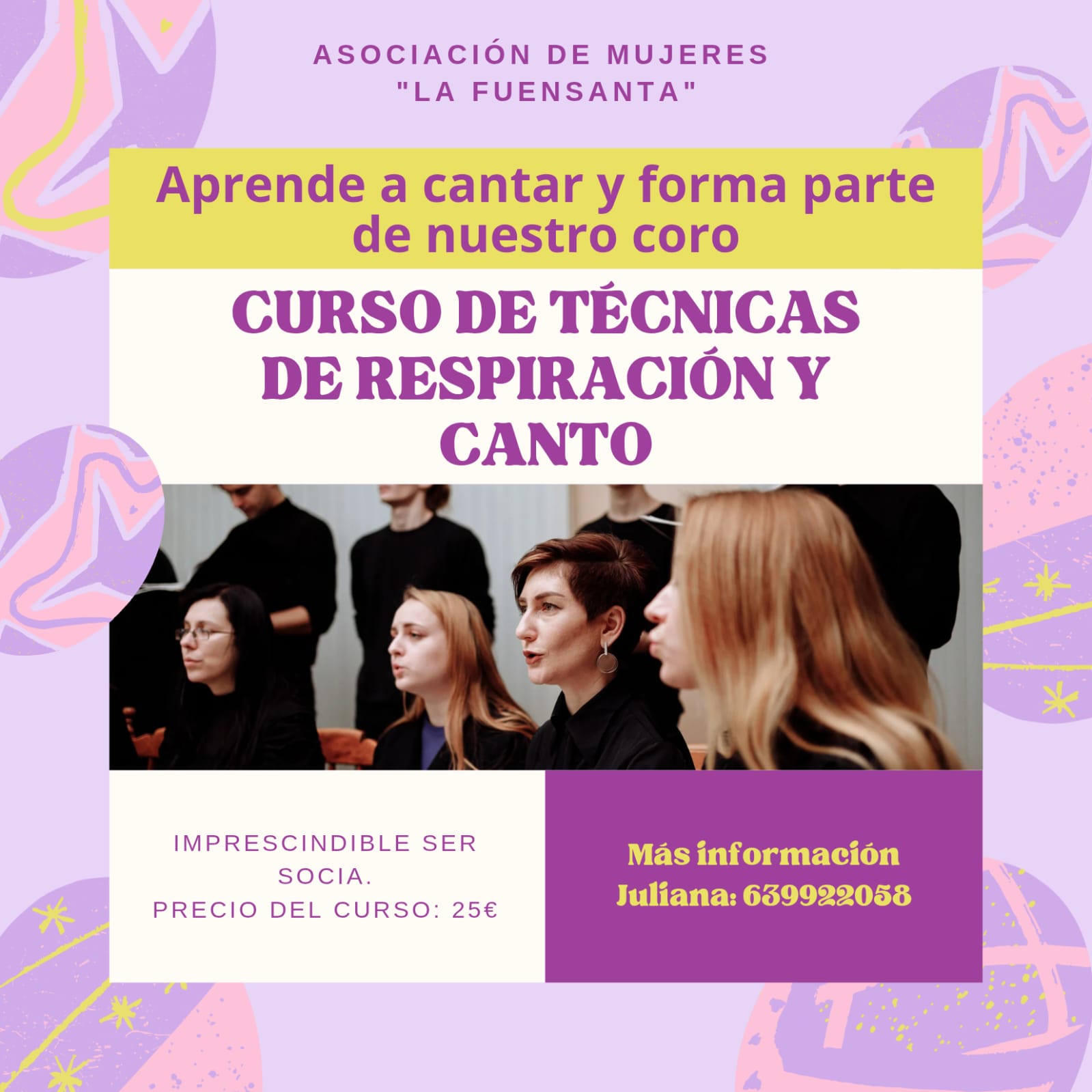 El próximo viernes 31 de octubre empezamos CURSO DE CANTO, de 16,30 h. a 19 h. En el ayuntamiento (aula de música). Matrícula del curso 25€. Quien quiera participar tiene que ser socia de la asociación.