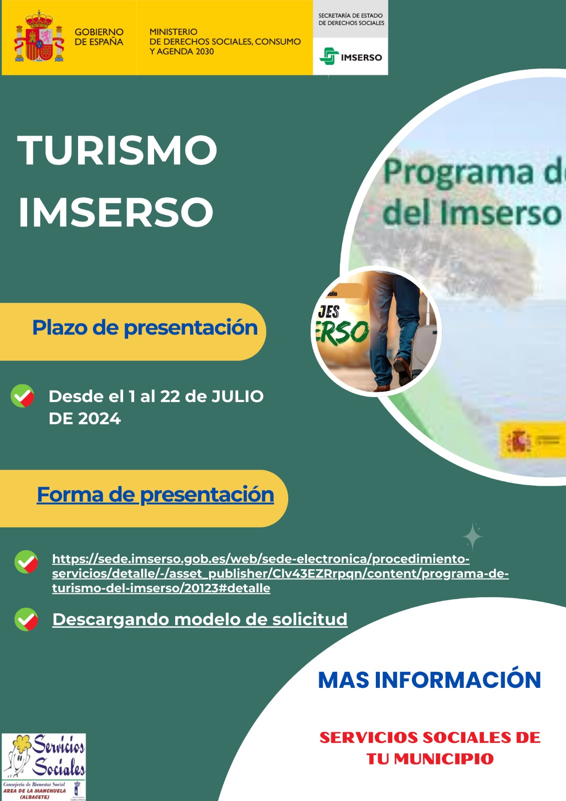 Solicitud Programa TURISMO IMSERSO2024-07-03 10:24:45Info GeneralEstá abierto el plazo a través de los Servicios Sociales municipales, los lunes de 11:30 a 13:30 sin necesidad de solicitar cita previa, sino sólo por orden de llegada, de solicitar información e inscripción en el PROGRAMA TURISMO IMSERSO.