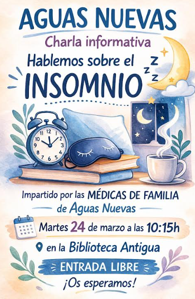 CHARLA INFORMATIVA SOBRE INSOMNIO IMPARTIDA POR LAS MÉDICAS DE FAMILIA DE AGUAS NUEVAS EL 24 DE MARZO A LAS 10:15 EN EL CENTRO SOCIAL POLIVALENTE