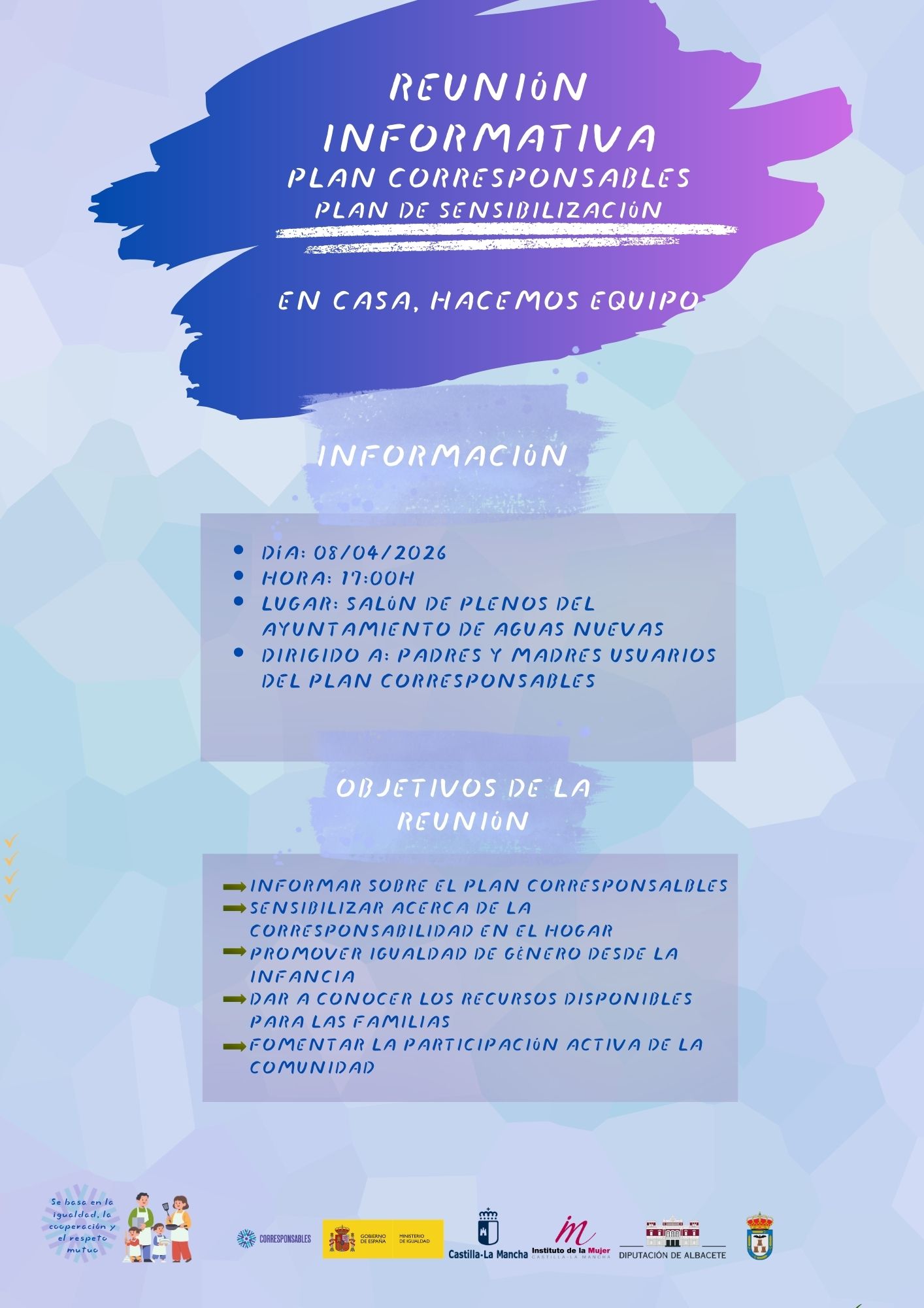 El próximo día 08 de abril tendrá lugar en el Salón de Plenos de la EATIM de Aguas Nuevas, a partir de las 17h, una reunión informativa dirigida a los padres y madres de niños que participan en las actividades del Plan Corresponsables 2025-2026.