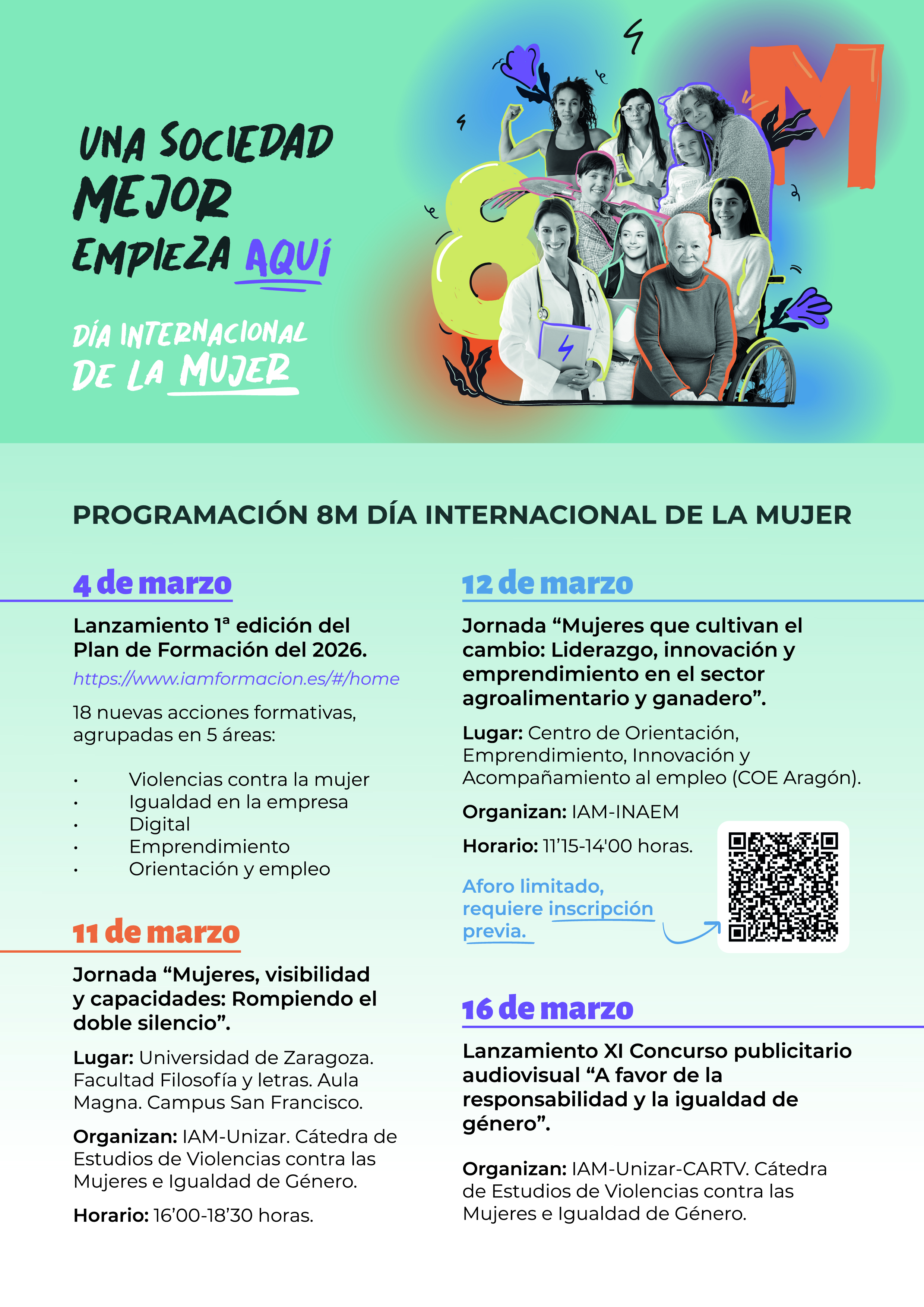 Desde el Instituto Aragonés de la Mujer y con motivo de la celebración del Día Internacional de la Mujer, 8 de marzo, queremos reafirmar el compromiso que debe estar presente en cada decisión pública y en cada espacio social bajo el lema “Una sociedad mejor empieza aquí”. Se quiere destacar que el cambio nace de lo cercano, desde la educación y el empleo, desde las instituciones y las empresas, desde el deporte, la ciencia y los hogares.