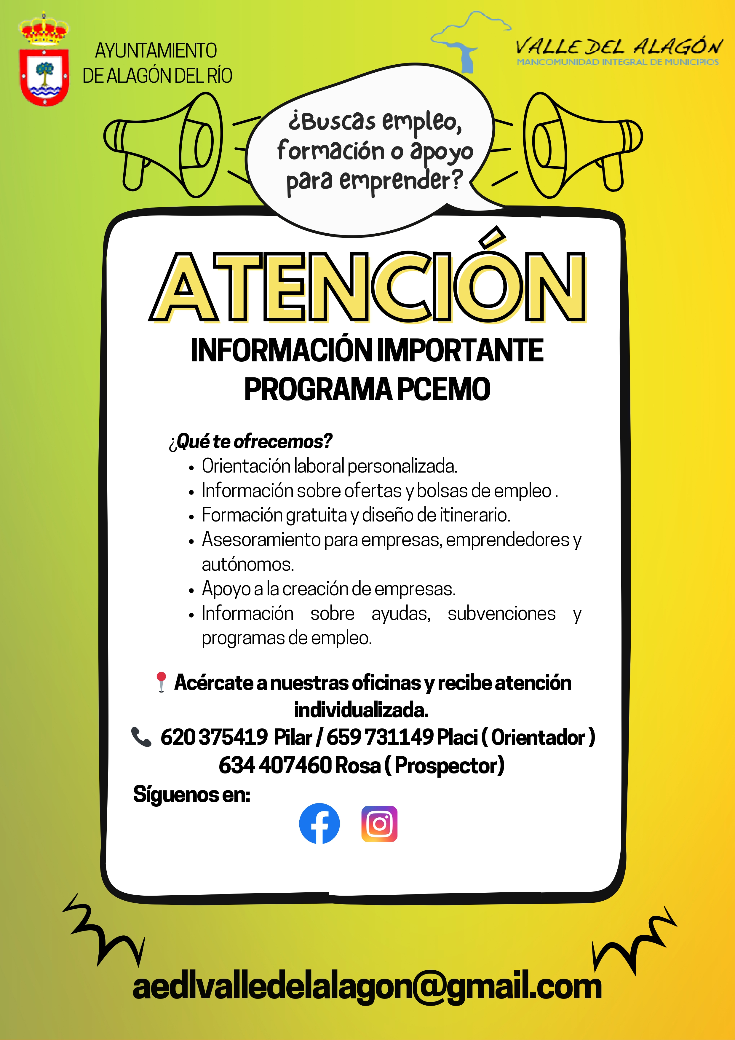 Os informamos que los martes y miércoles, de 09:00 a 14:00 h, en Alagón del Río, se ofrecerán servicios gratuitos de orientación laboral, formación, apoyo al emprendimiento, asesoramiento a empresas, se realizan los IPI ( Itinerarios), información sobre cursos, realizar y actualizar sus curriculos, hacer búsquedas de empleo.