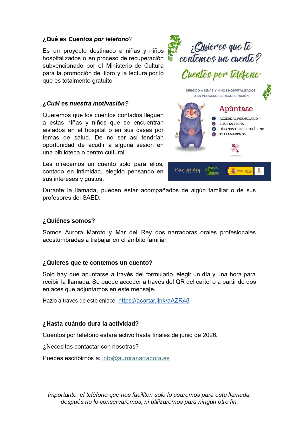 Es un proyecto destinado a niñas y niños hospitalizados o en proceso de recuperación subvencionado por el Ministerio de Cultura para la promoción del libro y la lectura por lo que es totalmente gratuito.