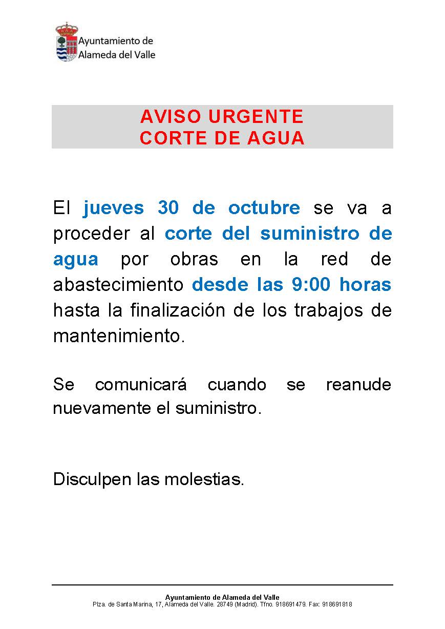 El jueves 30 de octubre se va a proceder al corte del suministro de agua por obras en la red de abastecimiento desde las 9:00 horas hasta la finalización de los trabajos de mantenimiento.