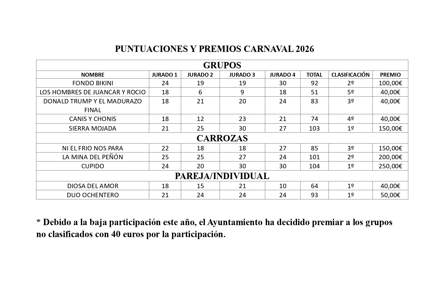 Se publica el listado de premios del Carnaval 2026. Premiados traer un número de cuenta para el abono al Ayuntamiento.