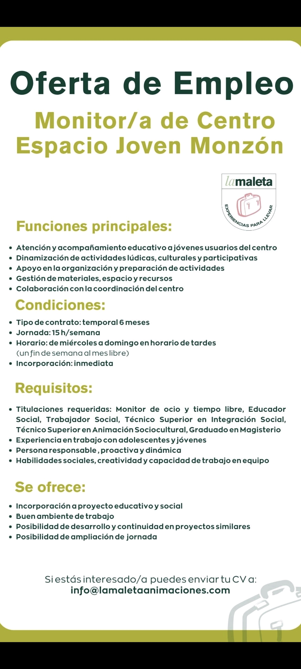 - Monitor/a de Centro en el Espacio Joven de Monzón