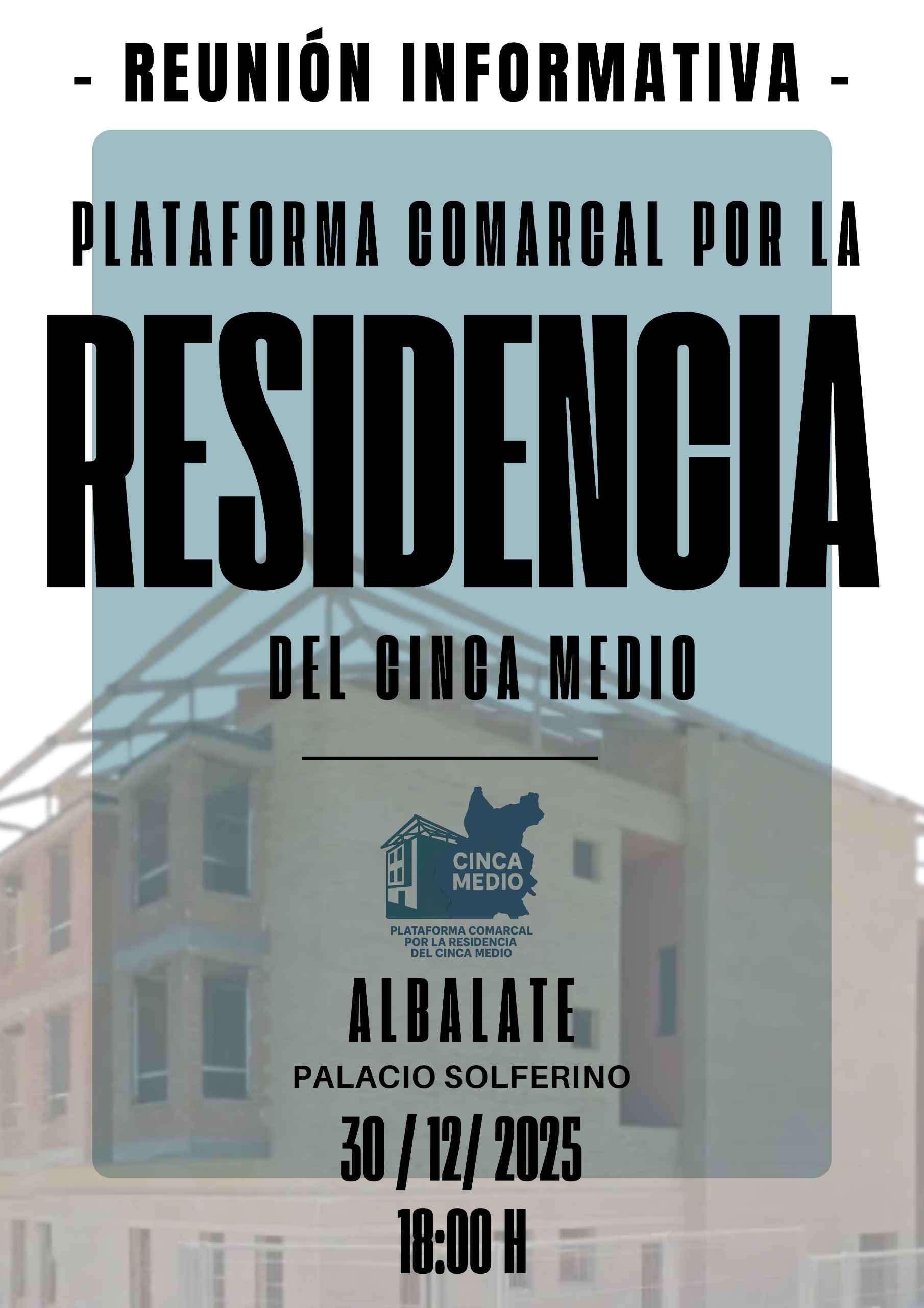 Se comunica la celebración de una reunión informativa organizada por la Plataforma Comarcal por la Residencia Cinca Medio. La sesión informará sobre asuntos relacionados con la Residencia Cinca Medio.