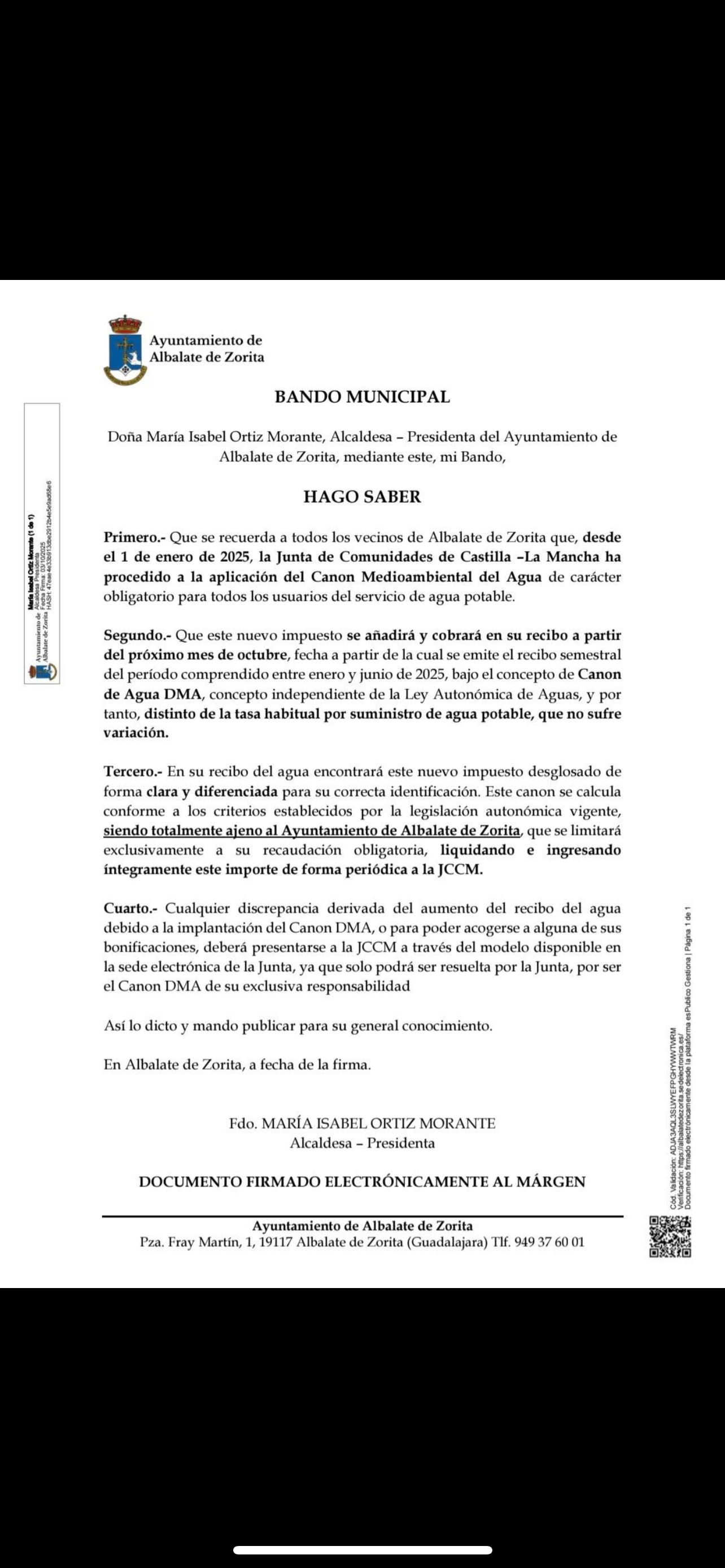 El Ayuntamiento de Albalate de Zorita informa a todos los vecinos que, a partir del 1 de enero de 2025, la Junta de Comunidades de Castilla-La Mancha aplicará el Canon Medioambiental del Agua (Canon de Agua DMA), un impuesto de carácter obligatorio para todos los usuarios del servicio de agua potable.