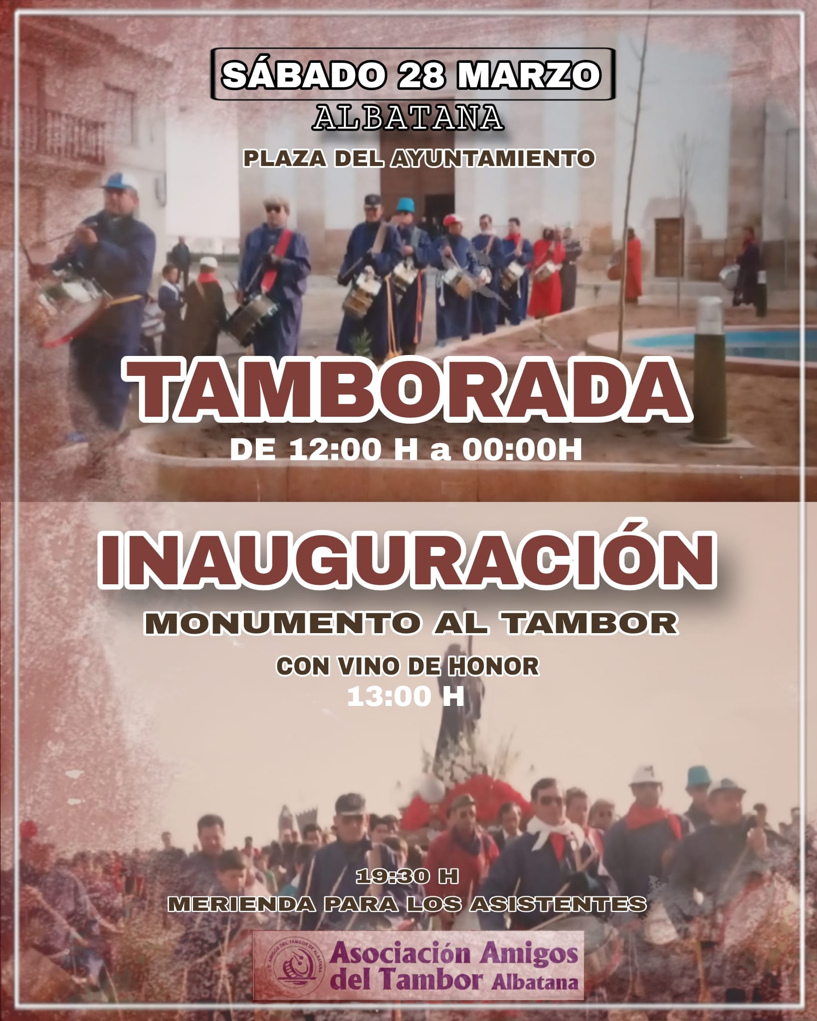 La Asociación Cultural Amigos del Tambor de Albatana invita a toda la población al acto de inauguración del monumento al tambor, que se celebrará el próximo sábado 28 de marzo a las 13:00 h en el parque municipal. A continuación la asociación ofrecerá un vino de honor.