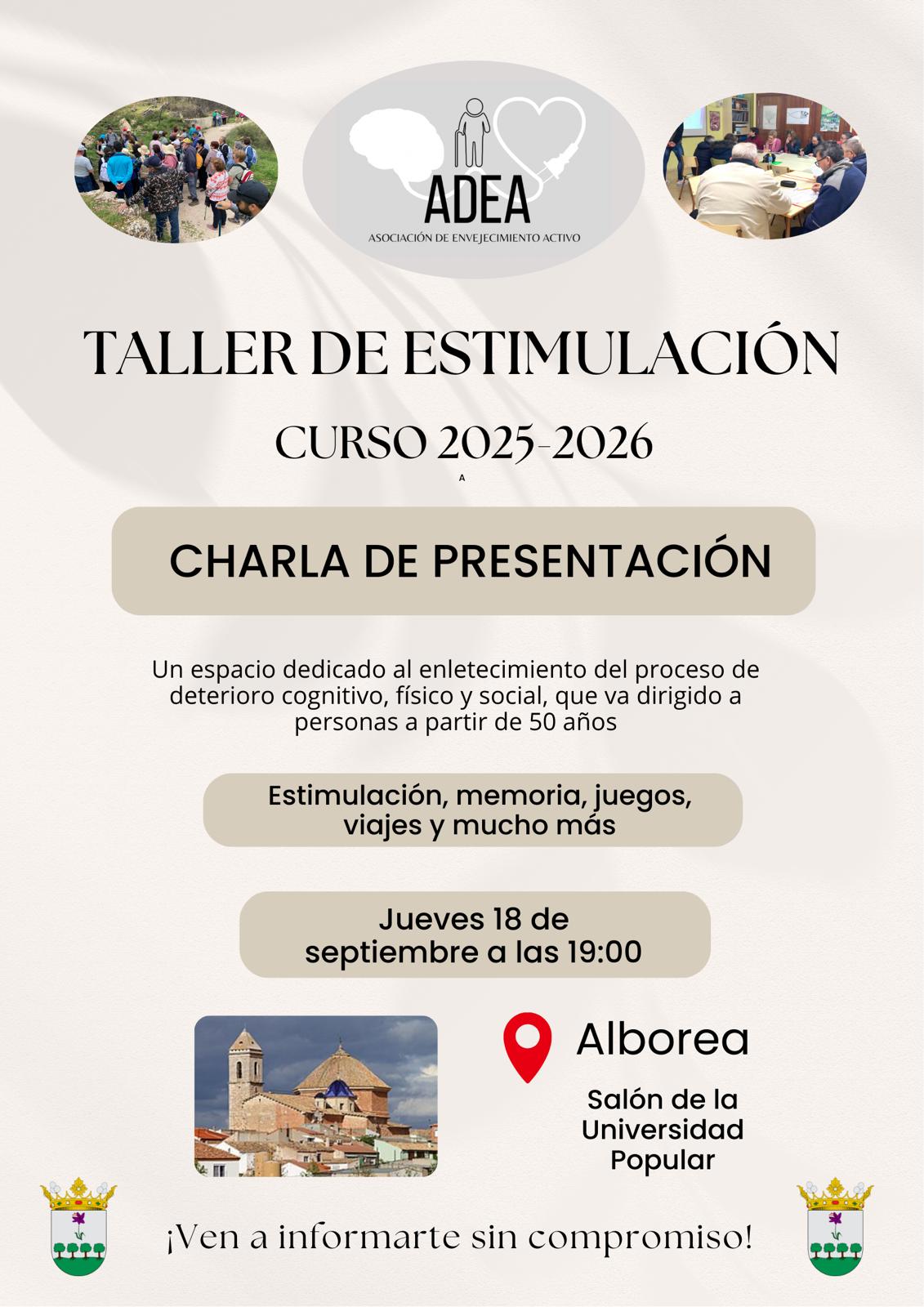 El próximo jueves, 18 de septiembre, en el salón de la universidad popular a las 19.00 horas se va a realizar una charla de presentación para la realización de un taller de estimulación dirigido a personas mayores de 50 años y enfocado en la realización de diversas actividades.