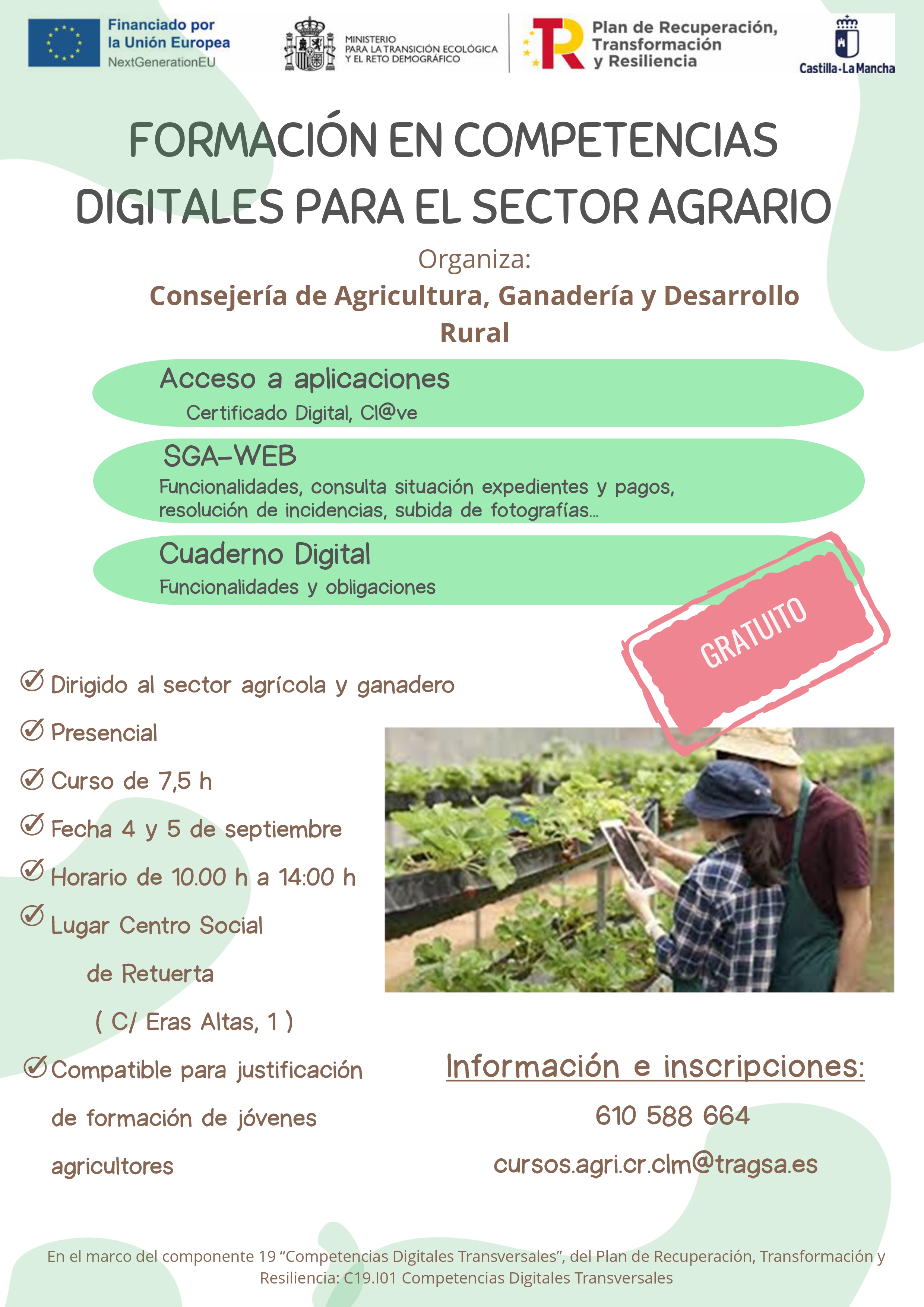 Se adjunta el cartel del curso para formación en competencias digitales para el sector agrario, dirigido al sector agrícola y ganadero.
