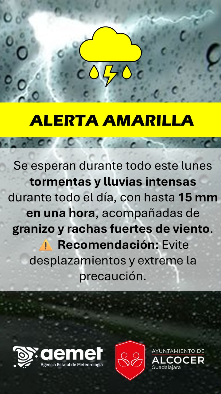 Se esperan fuertes precipitaciones y tormentas a lo largo de toda la jornada del lunes, con una precipitación acumulada de hasta 15 mm en una hora, que podrá ir acompañada de granizo y rachas de viento fuertes.