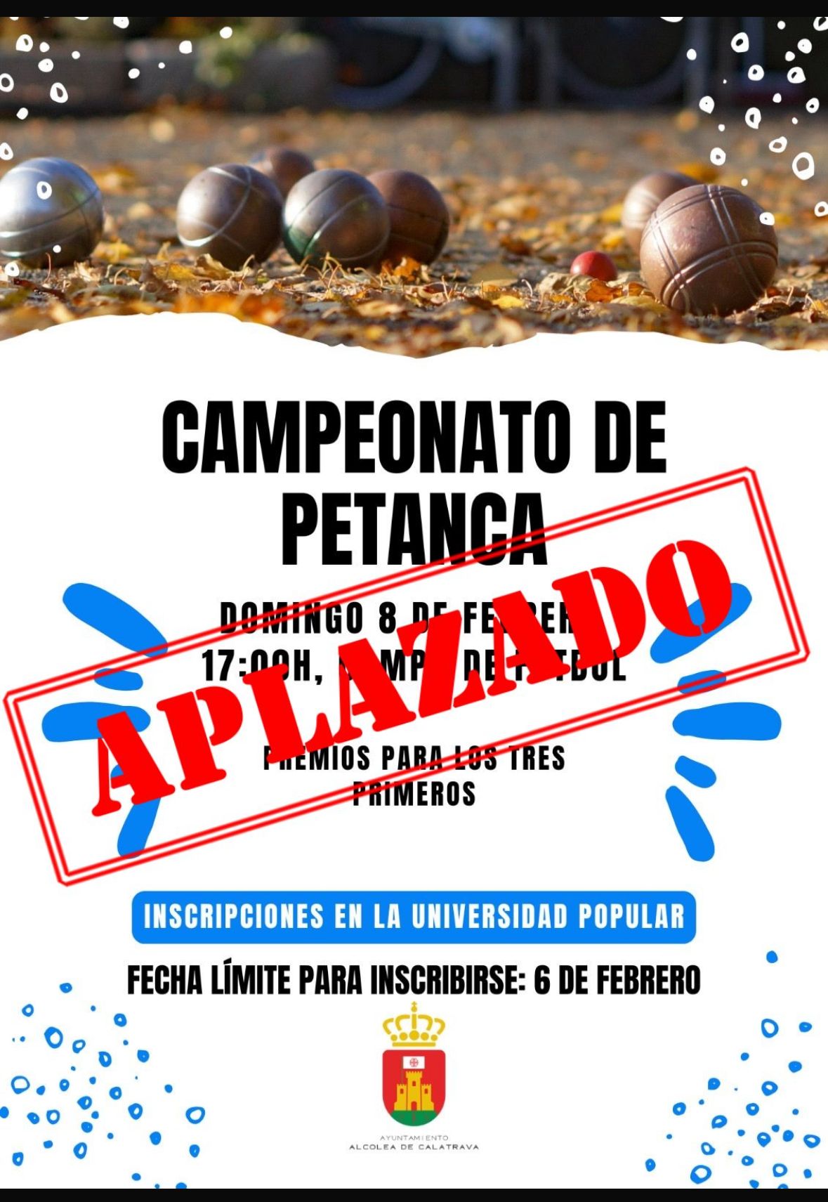 Debido a las lluvias de los últimos días y a la previsión desfavorable para la hora de celebración, el torneo de petanca previsto para domingo, 8 de febrero de 2026 queda aplazado.