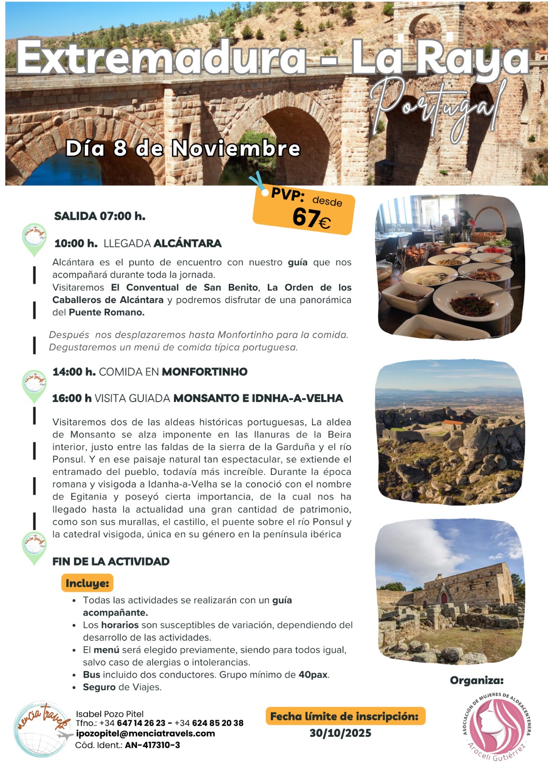 La Asociación de Mujeres informa a todas las vecinas y vecinos que el próximo día 8 de noviembre se realizará una excursión a Extremadura – La Raya (Portugal) (ver cartel informativo aparte).