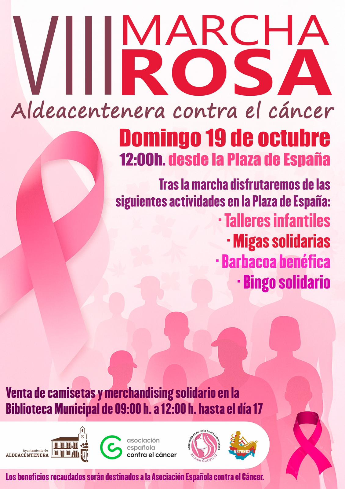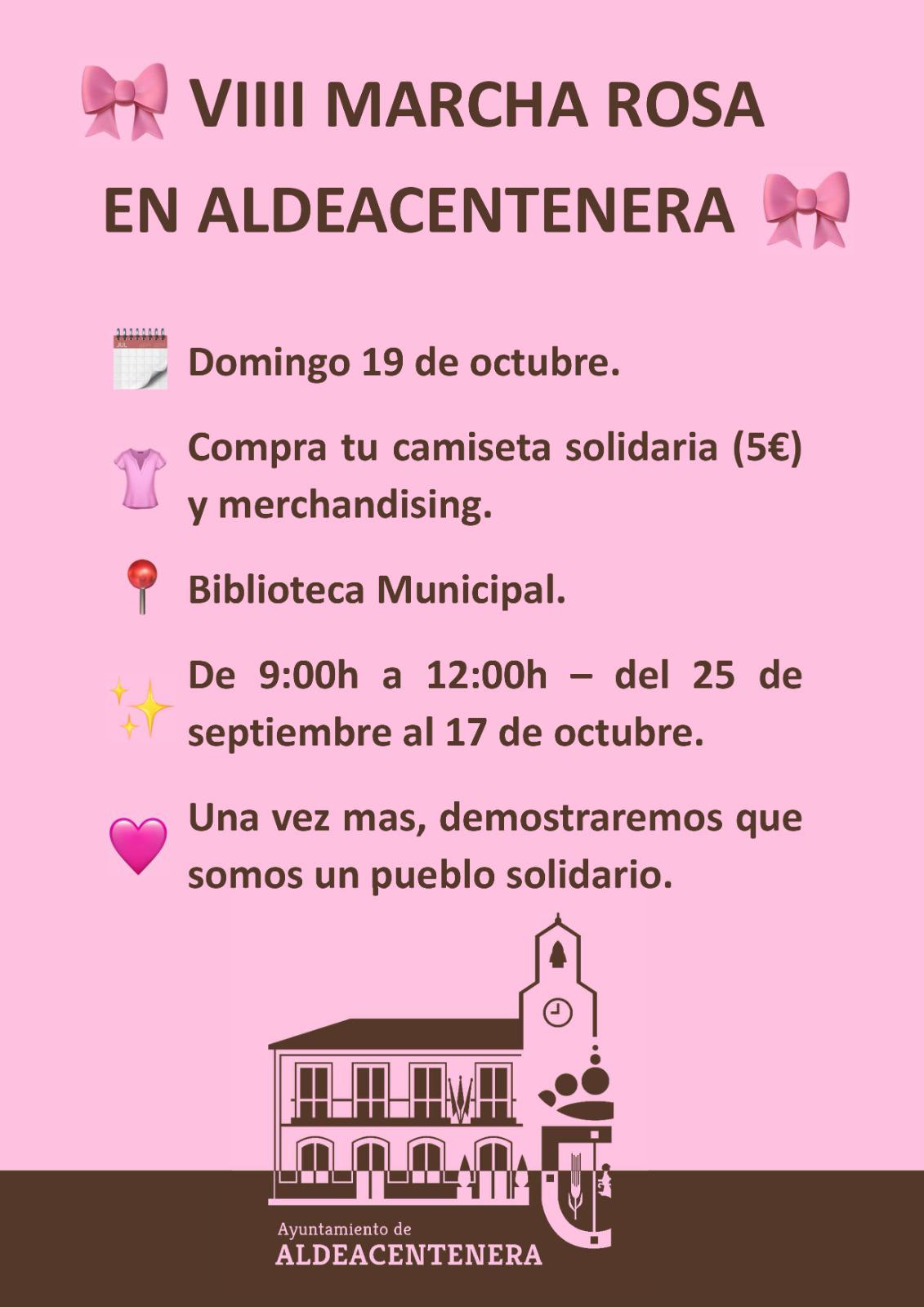 🌸 Un año más, nos unimos en la Marcha Rosa para teñir de esperanza las calles de Aldeacentenera en apoyo a la Asociación Española Contra el Cáncer, el próximo domingo día 19 de octubre, Día Mundial contra el Cáncer de Mama, a las 12:00h. desde la Plaza de España.