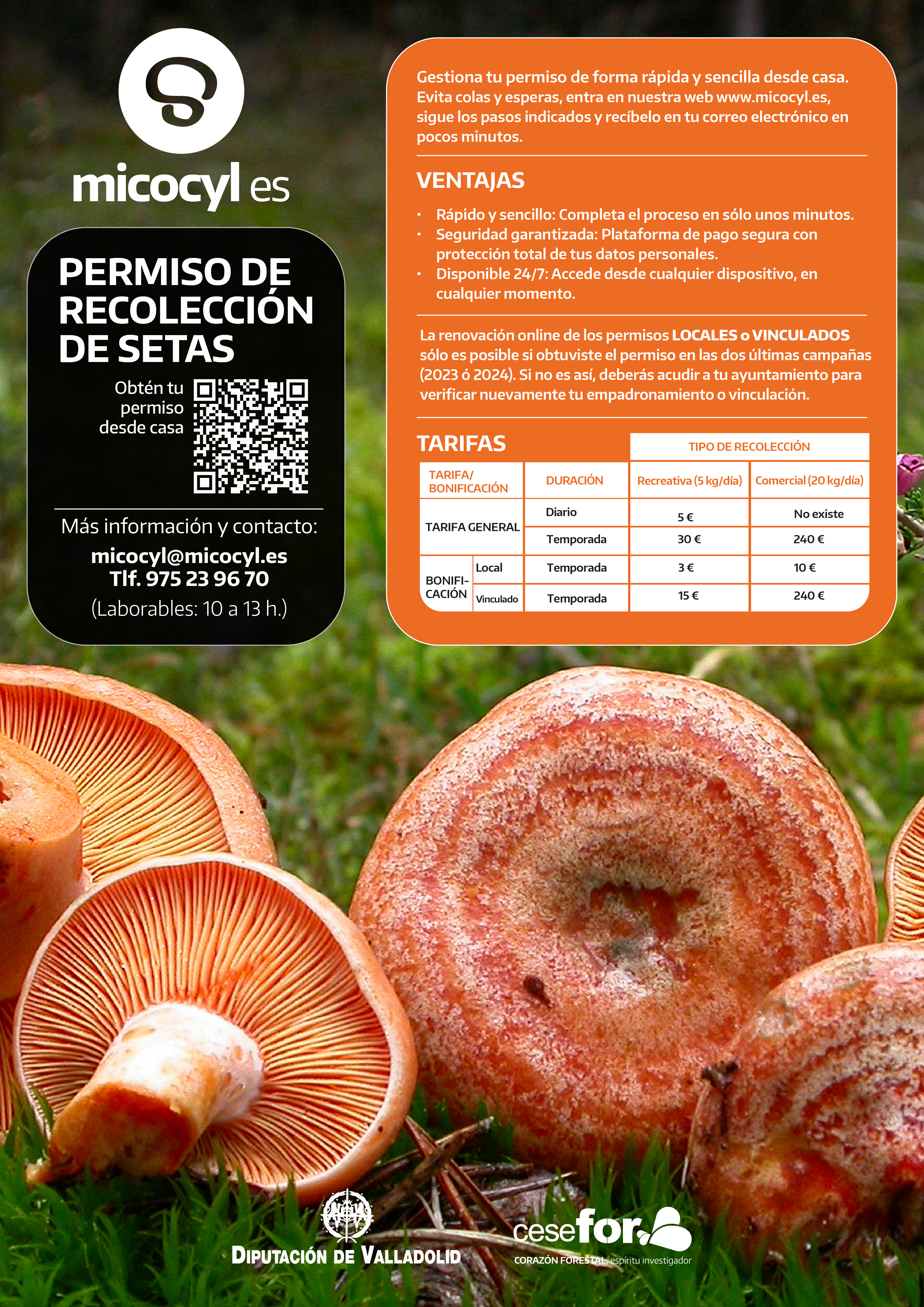 LOS PERMISOS PARA RECOLECTAR SETAS EN VALLADOLID (ACOTADO MICOLÓGICO VA-50.001) YA ESTÁN DISPONIBLES. LAS TARIFAS Y MODALIDADES SIGUEN SIENDO LAS MISMAS QUE EN AÑOS ANTERIORES.