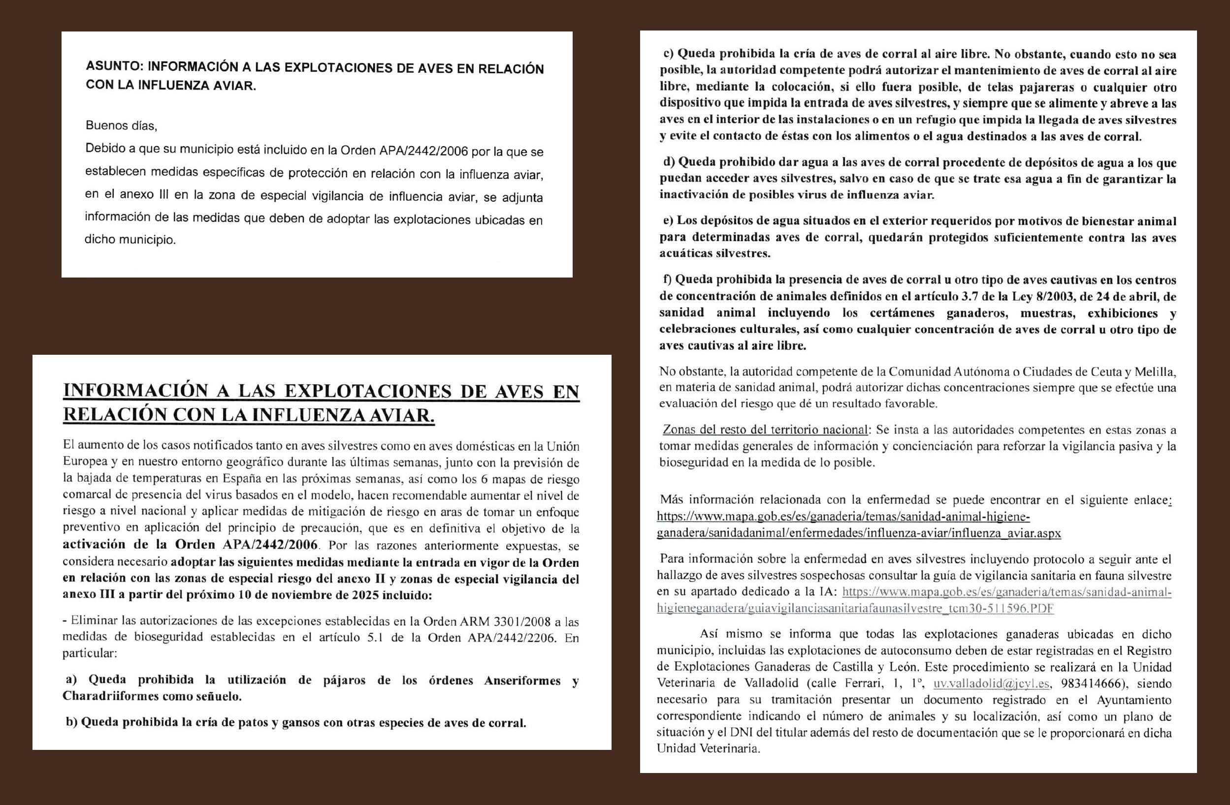 Debido a que Aldeamayor de San Martín está incluido en la orden APA/2442/2006, por la que se establecen medidas específicas de protección en relación con la influencia aviar, se traslada a los vecinos la información sobre las medidas que deben adoptar las explotaciones (o corrales domésticos) ubicados en el municipio.