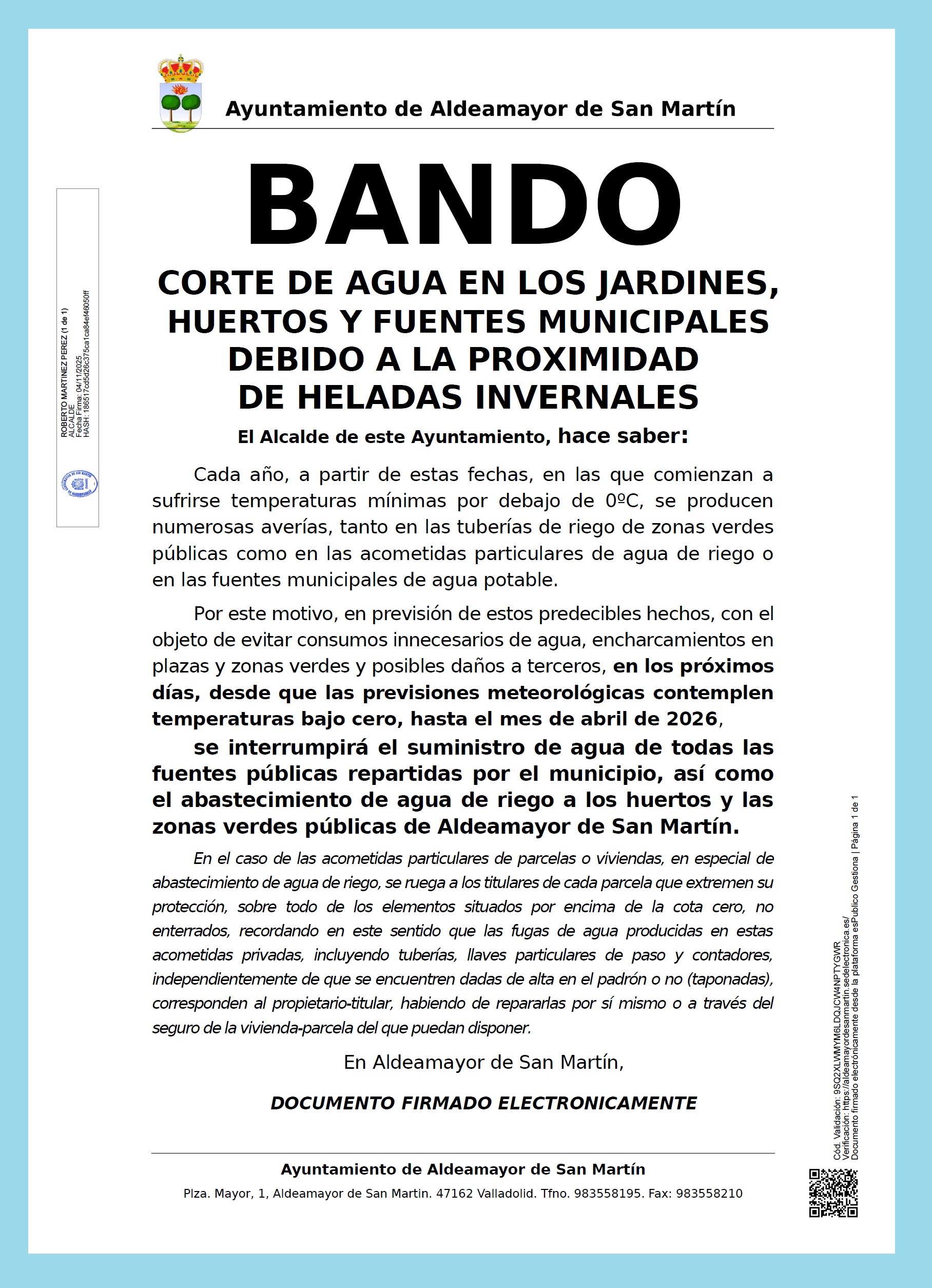 CORTE DE AGUA EN LOS JARDINES, HUERTOS Y FUENTES MUNICIPALES DEBIDO A LA PROXIMIDAD DE HELADAS INVERNALES